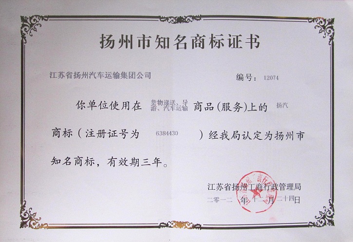 近日,集團公司注冊的證號為6384430的“揚汽”商標(貨物遞送、導游、汽車運輸)被揚州市工商行政管理局認定為“揚州市知名商標”。