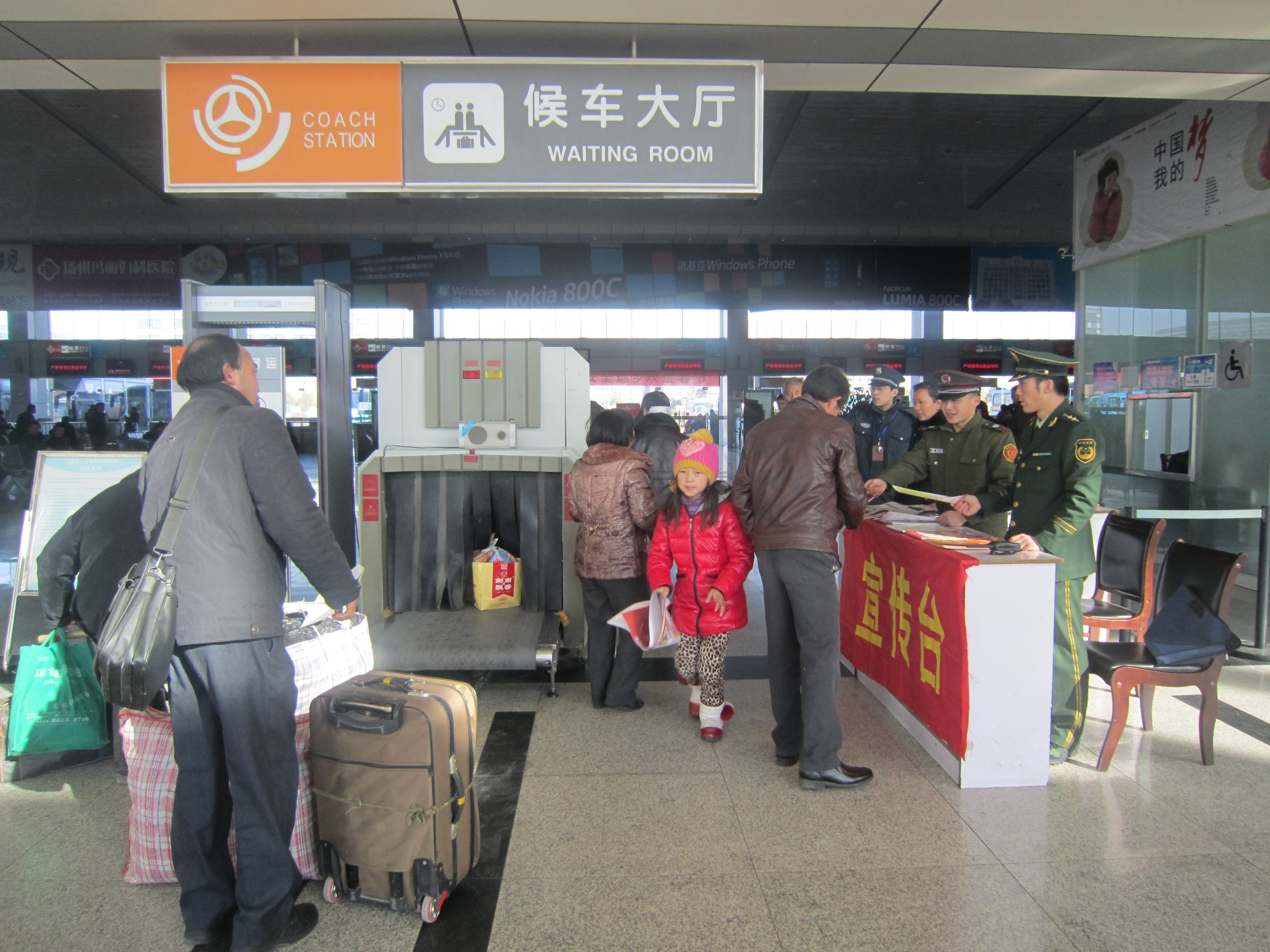 危險品檢查儀旁,紅色的安全宣傳臺引人注目,武警揚州消防支隊的幾名官兵和車站員工一起向接受危險品檢查的旅客熱情發(fā)放宣傳畫,并提醒在返鄉(xiāng)旅程中應(yīng)該注意的安全事項。幾名女官兵還走進候車廳發(fā)放,講解遇有緊急情況時的急救逃生知識。不少旅客在候車過程中,認真看著宣傳畫,還不時交流,一旁的官兵不時接受旅客的咨詢,解答他們的問詢。