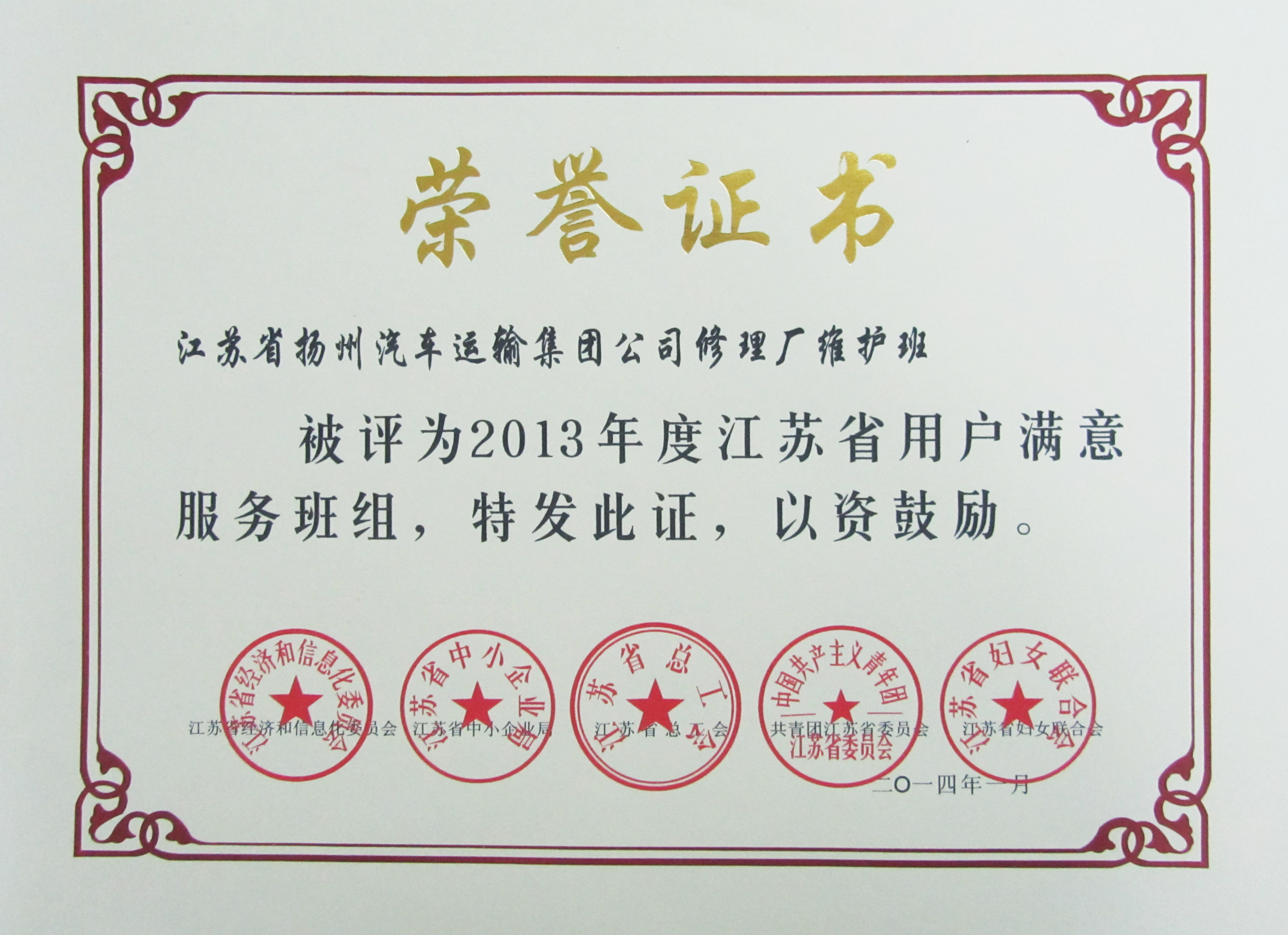 日前,由江蘇省經濟和信息化委員會、江蘇省總工會、江蘇省中小企業(yè)局等五家單位聯(lián)合開展的2013年度創(chuàng)建“用戶滿意服務”活動評審結果揭曉,我司修理廠維護班榮獲2013年度江蘇省“用戶滿意服務”班組,快客分公司殷鑫同志榮獲2013年度江蘇省“用戶滿意服務”明星稱號。