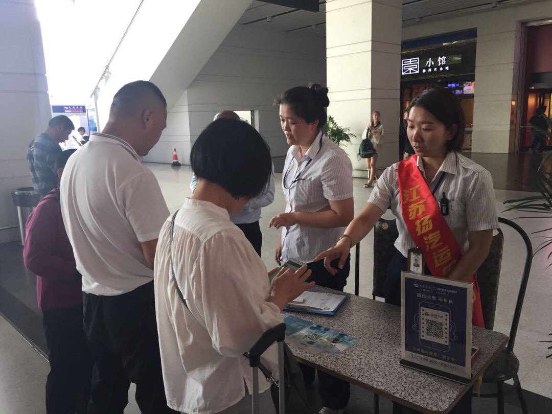 站外,揚(yáng)州站營銷小組在火車站下客區(qū)拉起橫幅,身披綬帶開展?fàn)I銷活動(dòng),推廣旅游包車業(yè)務(wù)和行包快運(yùn)業(yè)務(wù),免費(fèi)為過往旅客提供咨詢、兌換零錢、引導(dǎo)候乘等服務(wù)。讓外地來揚(yáng)的旅客對揚(yáng)汽集團(tuán)有了直觀的了解,感受到了我們熱情周到的服務(wù)。