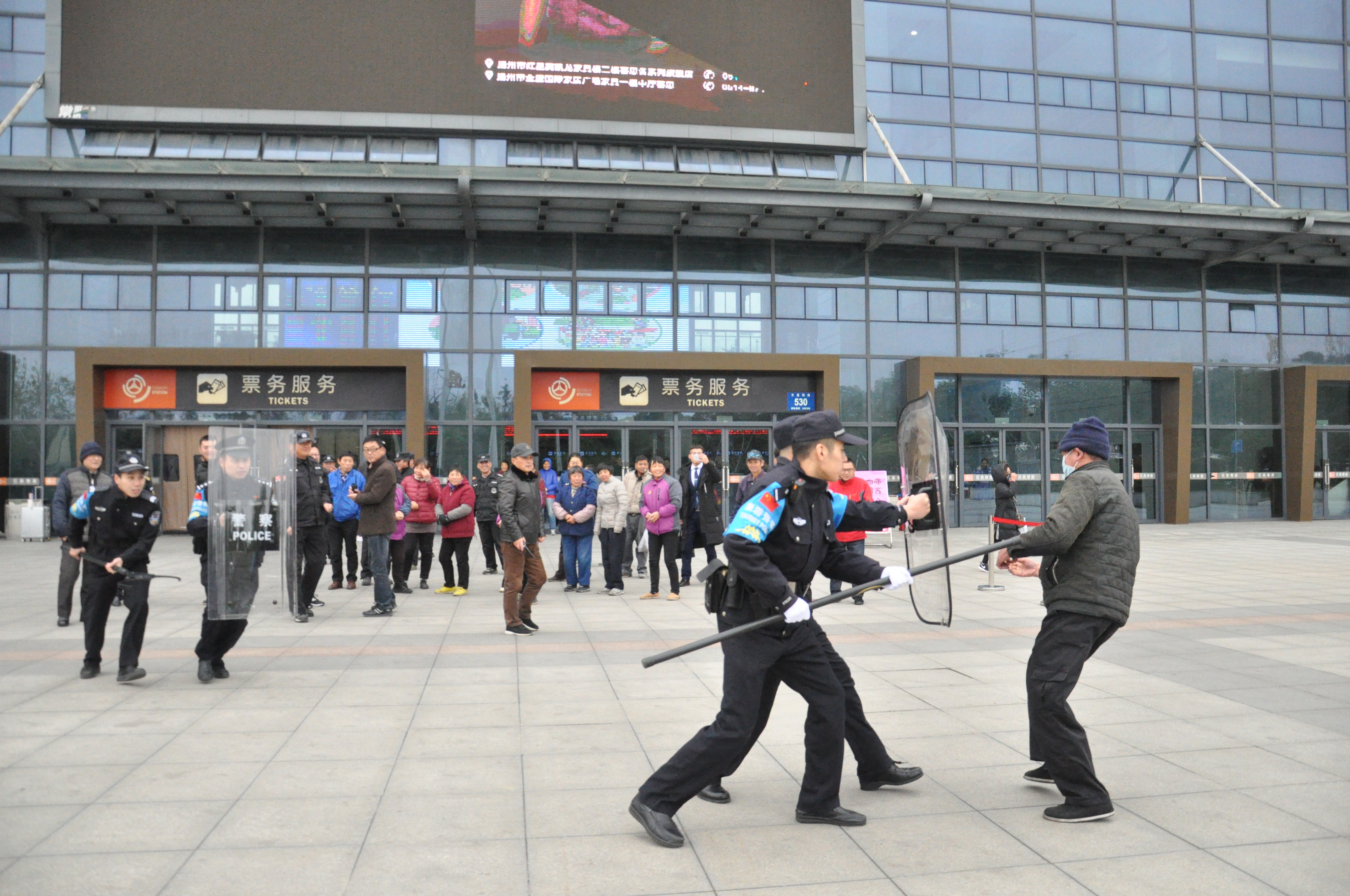 為有效防范公共場所可能發(fā)生的暴力恐怖事件,加強車站工作人員安全防范意識,提高對突發(fā)事件的應急處置能力,12月7日下午,揚州站聯(lián)合揚州市公安局公交治安分局汽車總站派出所,在站前廣場開展年度反恐防暴演練。