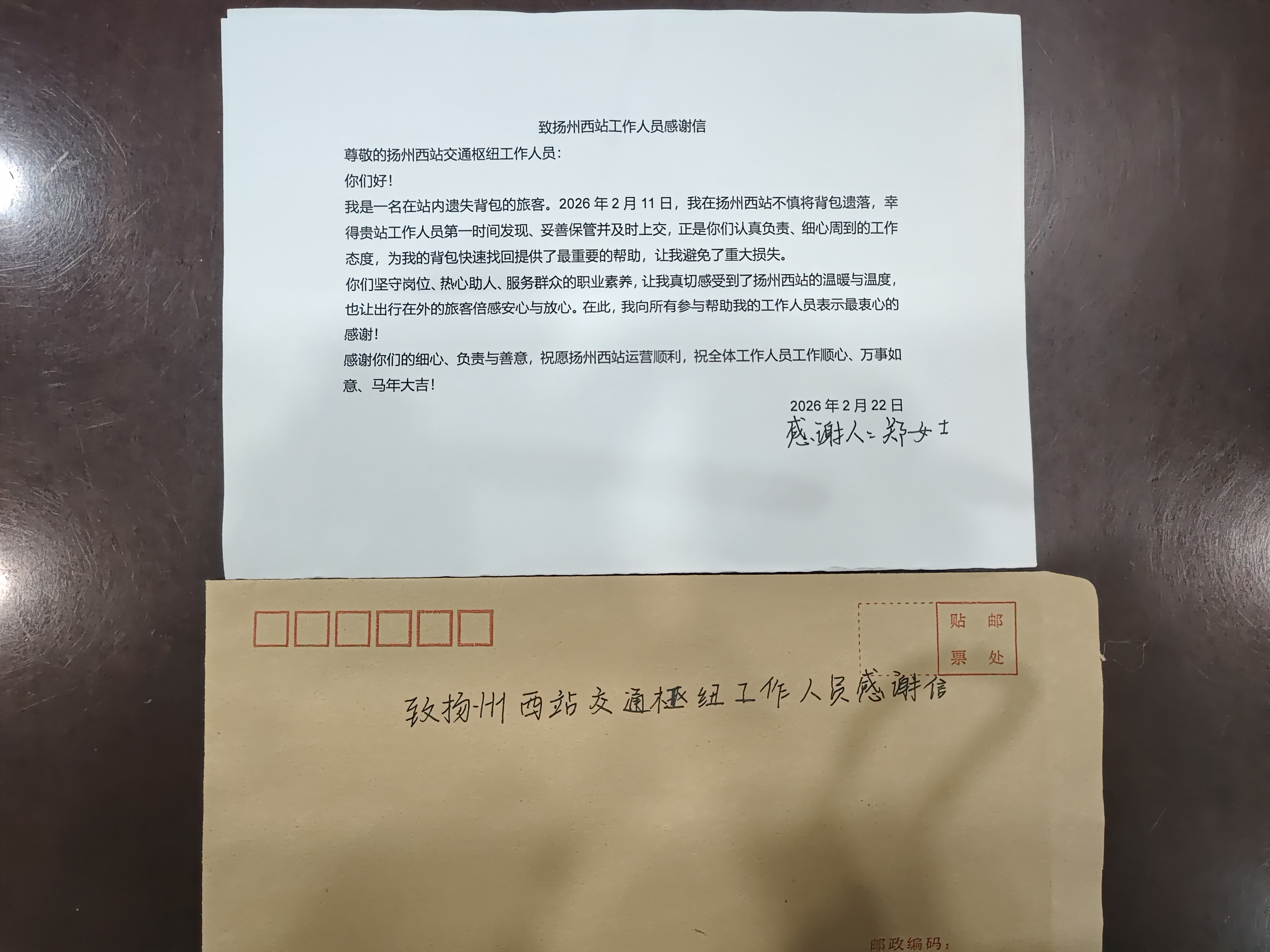 而這份“遲來”的感謝信,正是失主對(duì)揚(yáng)州站工作人員認(rèn)真負(fù)責(zé)態(tài)度的由衷肯定。信中寫道:“從發(fā)現(xiàn)失物到妥善保管、再到主動(dòng)對(duì)接,每一個(gè)環(huán)節(jié)都體現(xiàn)出你們嚴(yán)謹(jǐn)細(xì)致、熱心助人的職業(yè)素養(yǎng)。正是因?yàn)橛心銈冞@樣堅(jiān)守崗位、默默付出的工作人員,才讓揚(yáng)州這座‘好地方’更溫暖、更安心。”